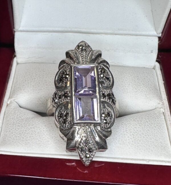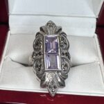 2 Amethyst Stones Center this Sterling silver ring that came from a ladies estate in America. Rumored among other rings in her collection to have been touched by her before she passed. Her spirit remains within them. Sterling silver size 6.