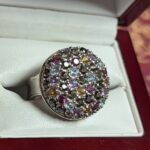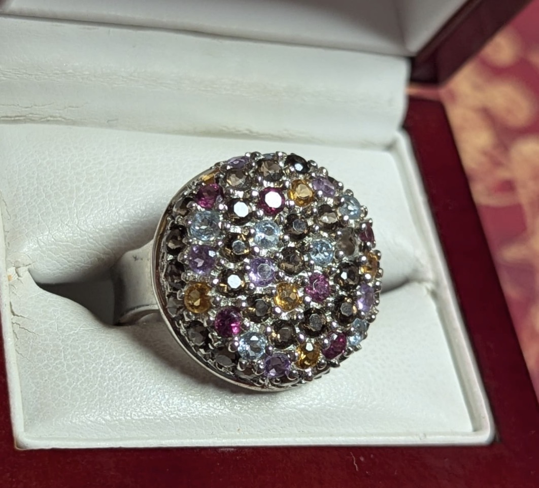 This individual and singular creation contains a rainbow of different color, gemstones and crystals. Once belonging to the estate of a woman now passed, this one among a number of her rings I said to be haunted being influenced by her before her passing and the spirits around her. Sterling silver, size 6 3/4.