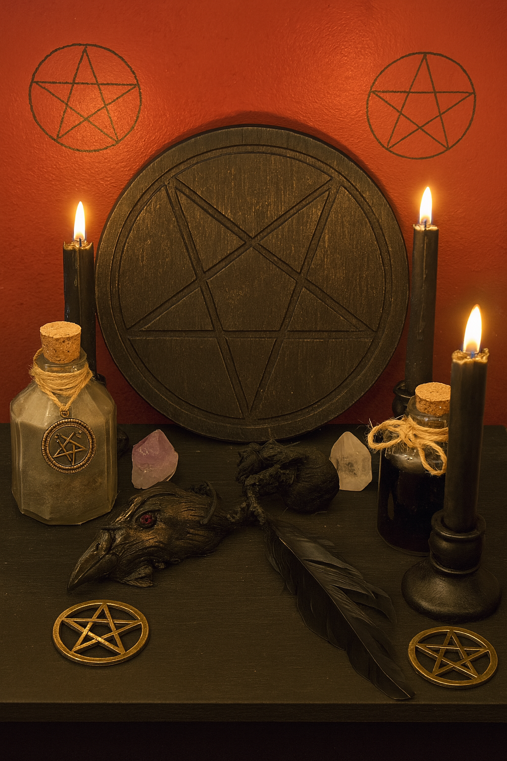 At its heart, the crow effigy anchors the spell, carved and adorned to watch over its keeper with an unyielding gaze. Attached is a ritual bag — tightly bound and sealed with intention — containing a secret blend of protective materia:
