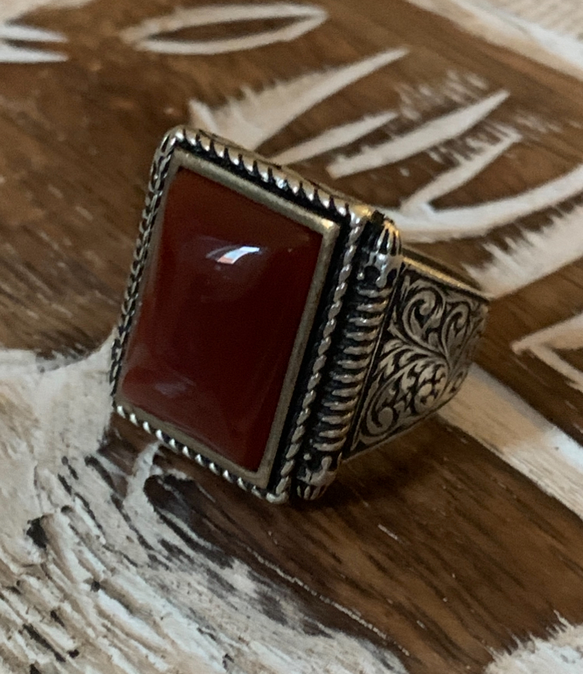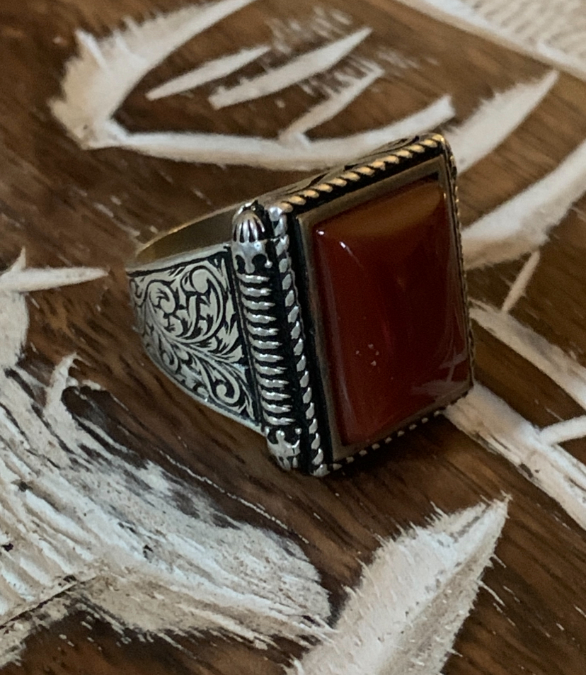 The ornate band, rich in traditional engravings, echoes ancient talismans worn by desert mystics and guardians. Carnelian, a stone of life force and action, is said to amplify will, attract strength, and ignite the spirit within.